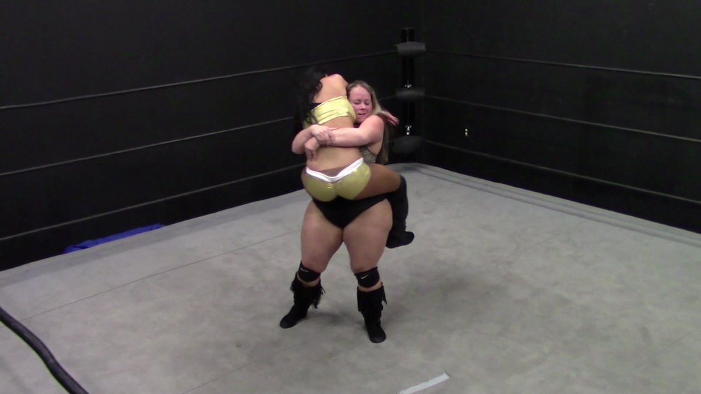 Malibu beats her up with not one shred of mercy, including using her bigger body size to her advantage time and time again, with her most favorite methods being Leg Drops, Body Splashes and Bearhugs. Of these three.....the Bearhug might be her number one favorite, as she relishes lifting Santana completely off the mat and shaking her like a ragdoll each time she applies it on her, before slamming her hard down to the mat!